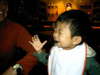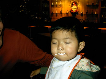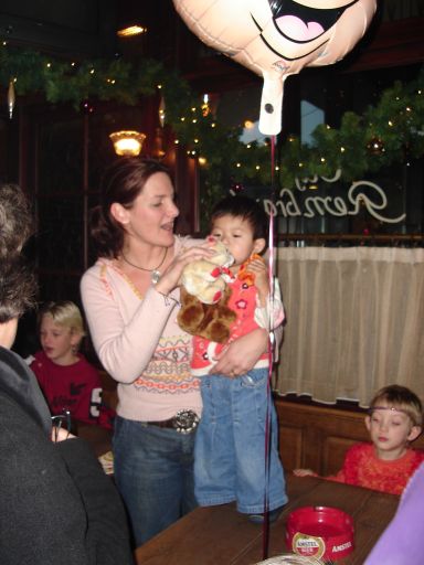 Bij gebrek aan een kinderstoeltje heeft Lynn heel lief al de tijd bij marjolein op schoot gezeten. In haar enthousiasme heeft ze een schaaltje en een aardewerken lepel van tafel gemaaid. Volgens de ober kon het niet meer gelijmd worden. Maar het is werkelijk ontroerend hoe fijn ze het vindt om op schoot te zitten en geknuffeld te worden. Dat kan ze uren volhouden. (wij ook!!)